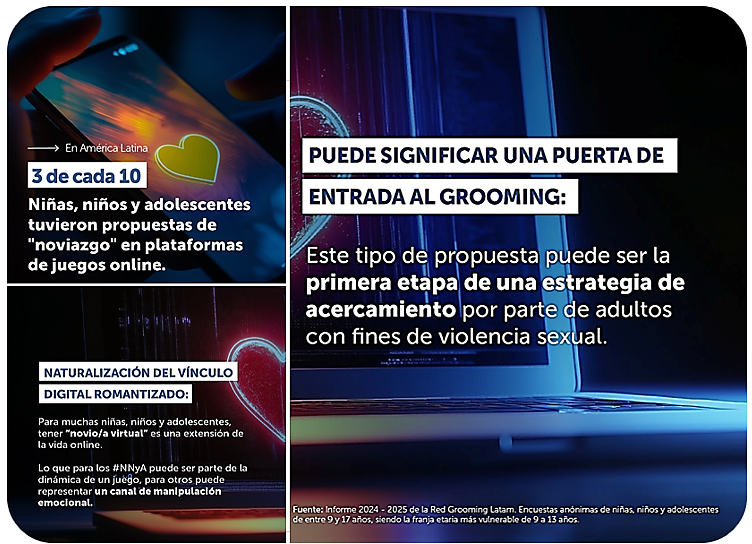 Según la información recopilada en el informe de nuestra Red Grooming Latam, a 3 de cada 10 NNyA le propusieron ponerse de “novios/as” a través de juegos online.